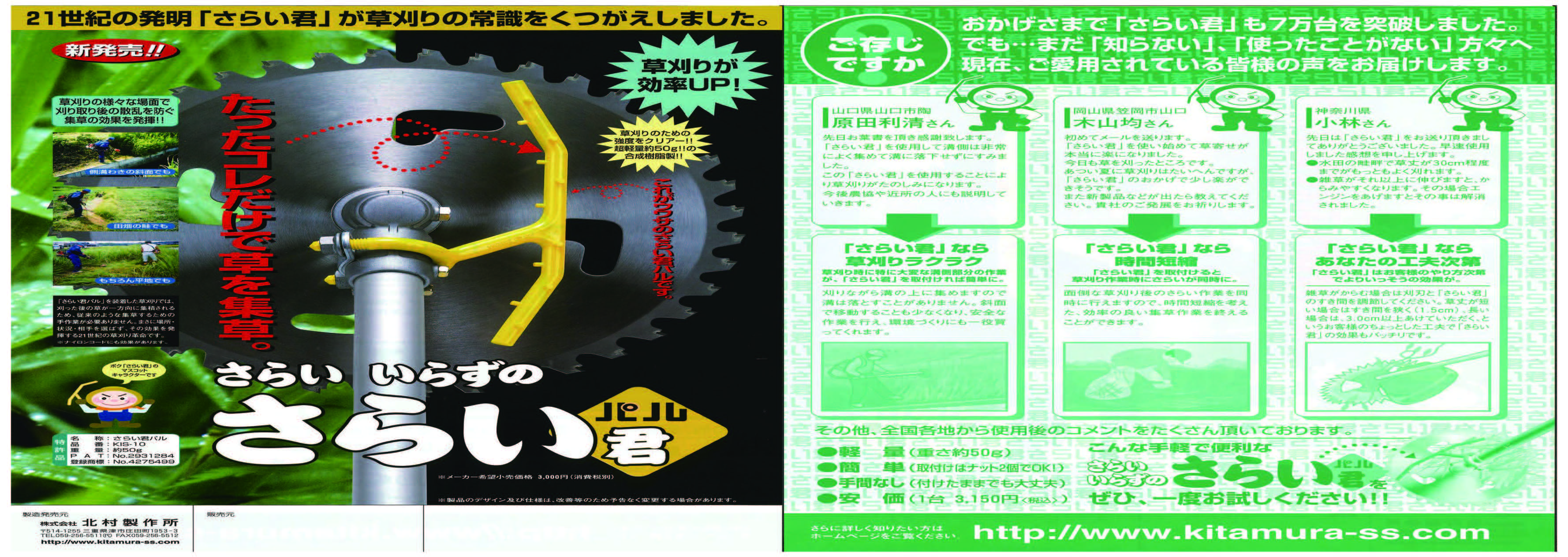 草刈機に取り付けるだけで草を刈りながら寄せることができます。また、50gと軽量なので草刈作業の負担にもならず効率よく草刈作業ができます。田畑や水路に草を落とさずに作業できるので後始末がラクになるアイデア商品です。